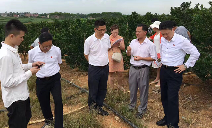 (深圳華錦億爵商業(yè)地產(chǎn)顧問機(jī)構(gòu)總策劃師謝金杏先生(左三)、國家行政學(xué)院政府經(jīng)濟(jì)研究中心副主任研究員、好易農(nóng)科技有限公司董事長張?jiān)觳┦浚ㄓ乙唬钊胝{(diào)研貴港市種植業(yè)發(fā)展情況)