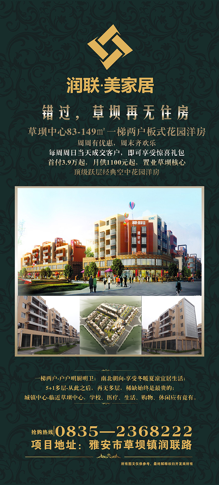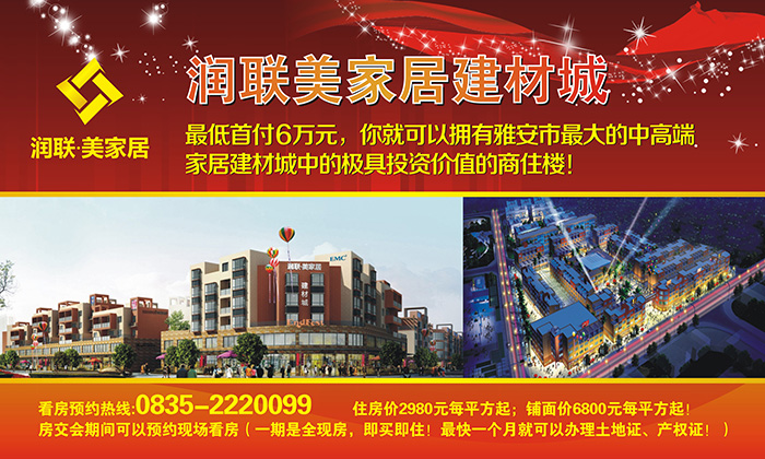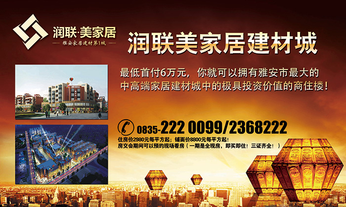 潤聯美家居建材城,位于四川雅安市,由香港潤聯國際投資有限公司投資,雅安市潤聯投資置業有限公司開發并傾力打造的雅安市中高端家具建材飾品以及家裝一體化的大型生態型家居購物MALL。