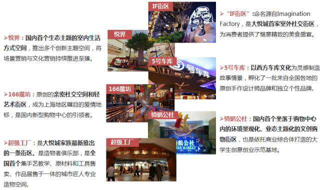 以大悅城為例,在原有商場(chǎng)的基礎(chǔ)上,打造出獨(dú)具特色的“悅界”、“5號(hào)車庫(kù)”“IF街區(qū)”、“魔方166”等特色主題街區(qū),提供多樣化服務(wù)來制造新的利潤(rùn)增長(zhǎng)點(diǎn)。